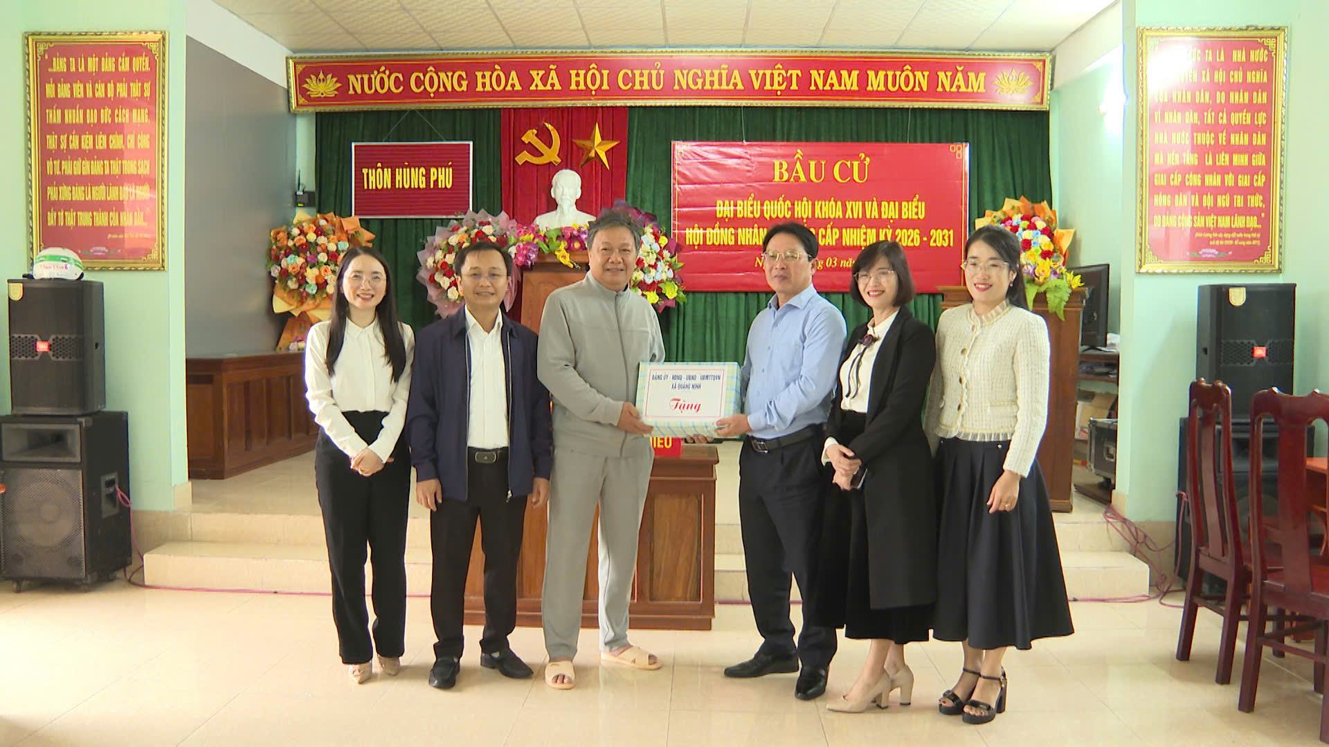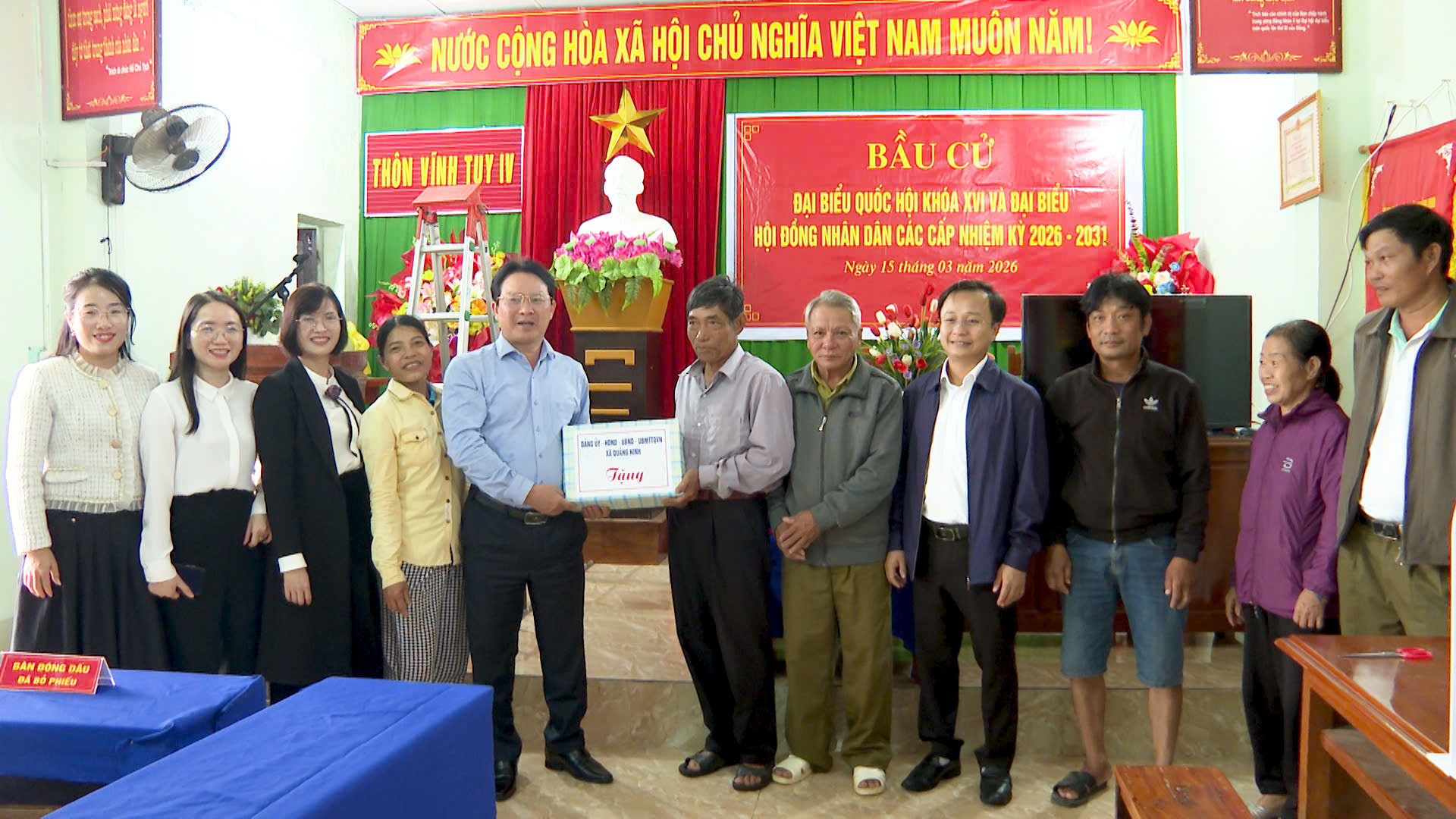 Dịp này, lãnh đạo xã Quảng Ninh đã tặng quà động viên các Tổ bầu cử.