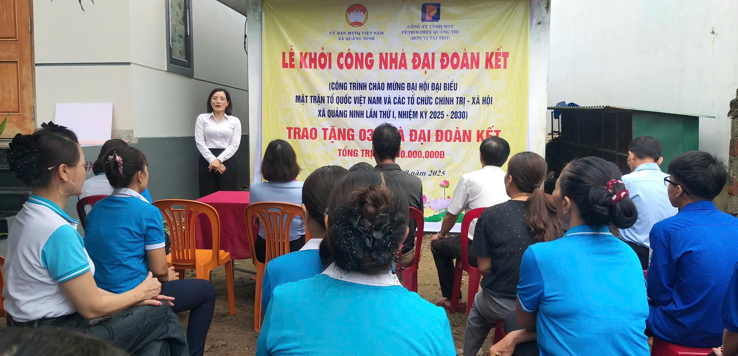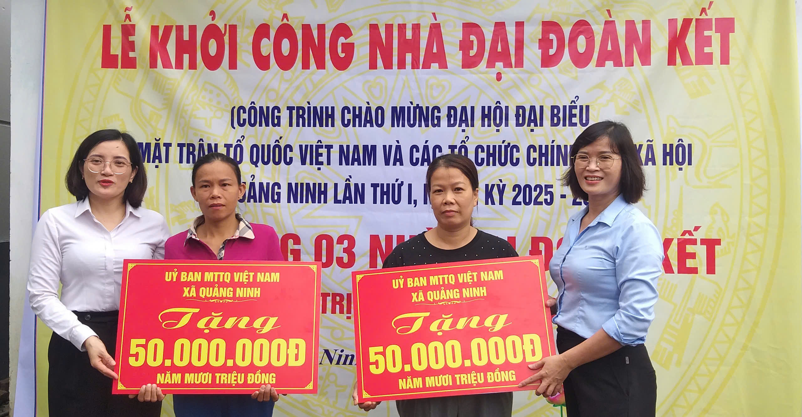 Hướng tới chào mừng Đại hội đại biểu Mặt trận Tổ quốc Việt Nam xã Quảng Ninh lần thứ I, nhiệm kỳ 2025-2030, sáng 23/9/2025, tại hộ gia đình bà Bùi Thị Huyền ở thôn Văn La, Ban Thường trực UBMTTQ Việt Nam xã Quảng Ninh tổ chức lễ khởi công xây dựng nhà đại đoàn kết cho 3 hộ gia đình có hoàn cảnh khó khăn trên địa bàn.