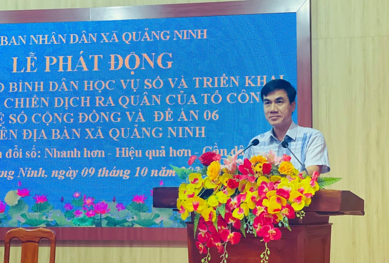 Tại lễ phát động, đồng chí Chủ tịch Ủy ban nhân dân xã Quảng Ninh Trần Xuân Tình nhấn mạnh: phong trào “Bình dân học vụ số” là bước đi thiết thực nhằm giúp người dân tiếp cận công nghệ, sử dụng thành thạo các ứng dụng số, dịch vụ công trực tuyến và thanh toán không dùng tiền mặt. Đồng chí kêu gọi toàn thể cán bộ, đoàn viên, hội viên và nhân dân tích cực hưởng ứng phong trào, mỗi người dân trở thành một “công dân số”, góp phần thực hiện hiệu quả Đề án 06 của Chính phủ, xây dựng chính quyền số, xã hội số ngay từ cơ sở.