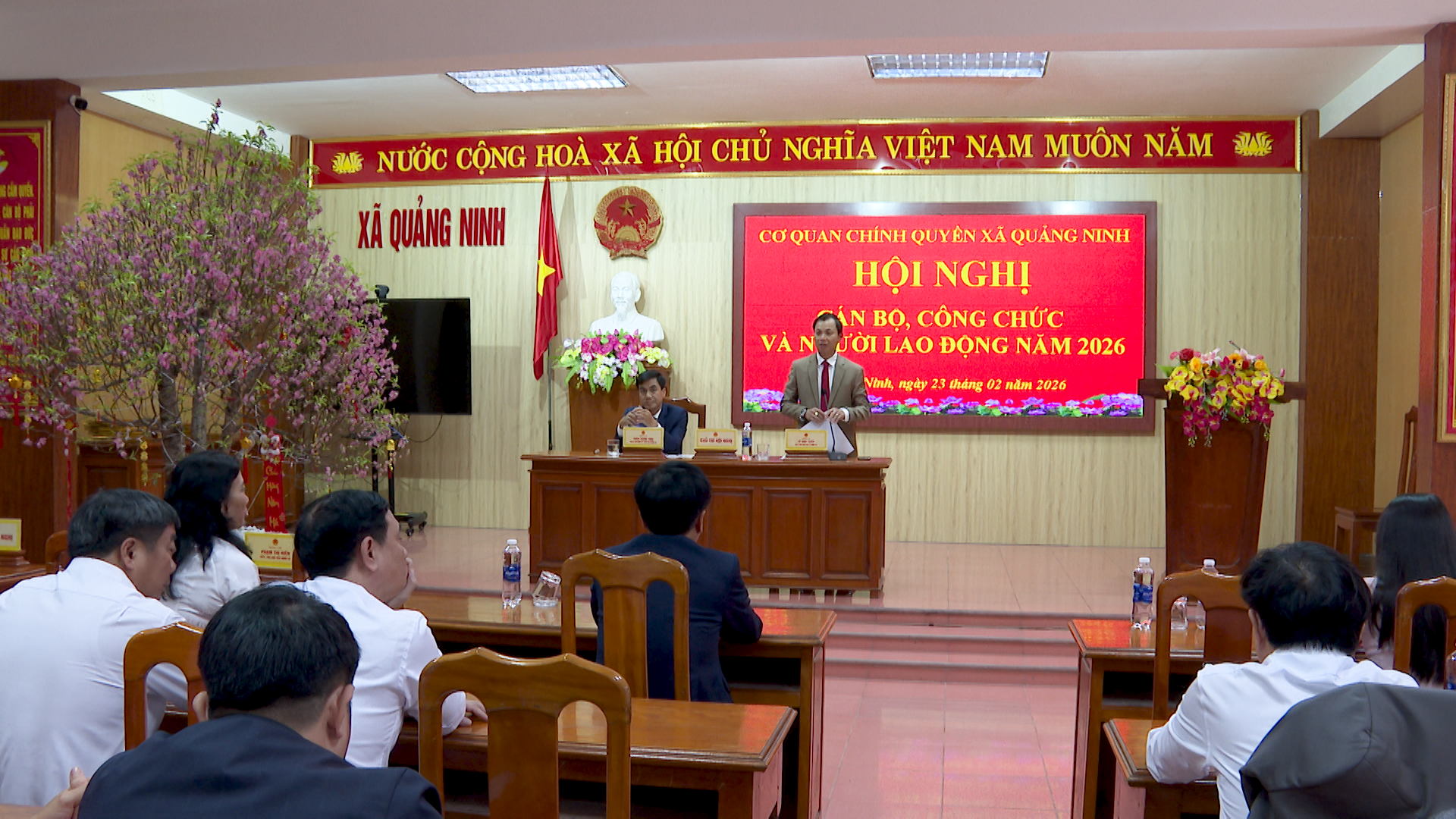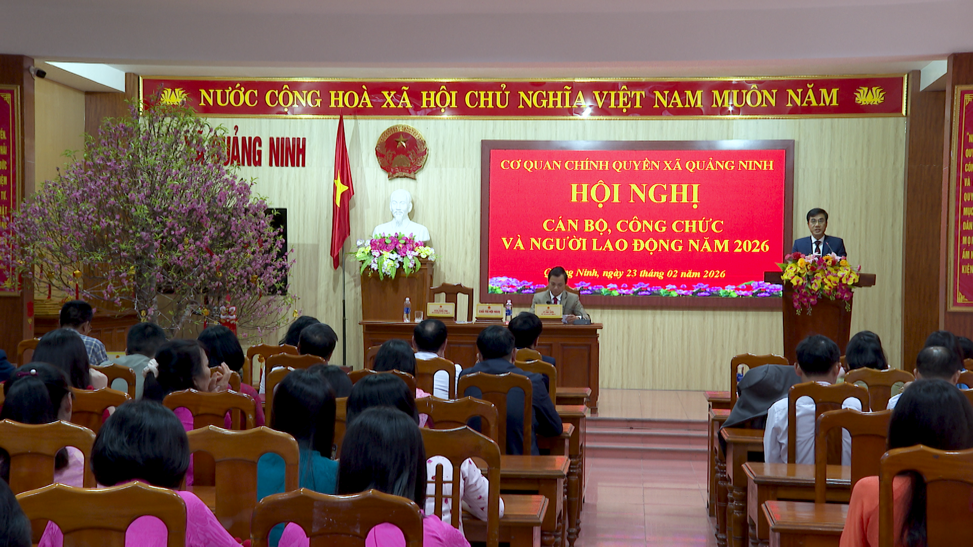 Chiều 23/2/2026, Cơ quan Chính quyền xã Quảng Ninh tổ chức hội nghị cán bộ, công chức, người lao động năm 2026. Đồng chí Trần Xuân Tình, Phó Bí thư Đảng ủy, Chủ tịch UBND xã, Bí thư Đảng ủy UBND xã, Thủ trưởng cơ quan chính quyền và đồng chí Lê Anh Tuấn, Ủy viên Ban Thường vụ Đảng ủy, Phó Chủ tịch Thường trực UBND xã; Phó Bí thư Đảng ủy UBND xã chủ trì hội nghị.